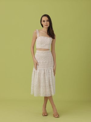 Ivory floral guipure lace coordinated semi-haltered top and A-line tea length skirt with sheer detail