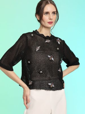 Black crochet top with short sleeves embellished with beaded bees and appliques with trimming details on the neckline