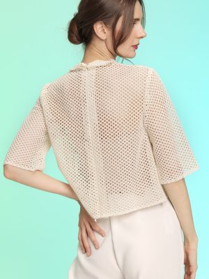 Cream crochet top with short sleeves embellished with floral lace appliques with trimming details on the neckline