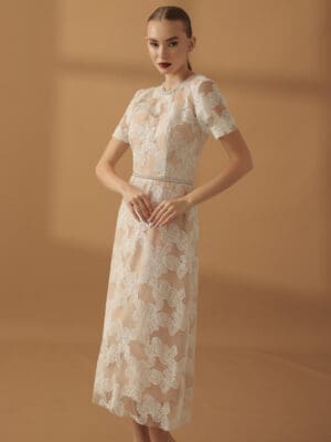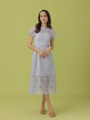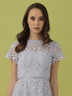 Powder blue floral guipure lace midi dress with sheer detail on the bodice and short sleeves; with A-line skirt