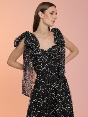 Black and white floral embroidered tea length dress with sweet heart neckline, ruched bodice and with bows as straps and bias cut gathered skirt