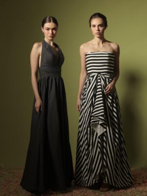 Black Mikado silk coordinated corseted cropped top with straps with pencil cut midi skirt embellished with gold accents
