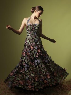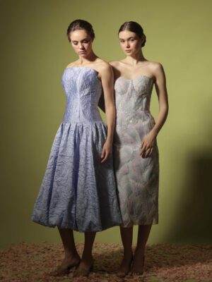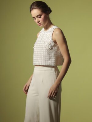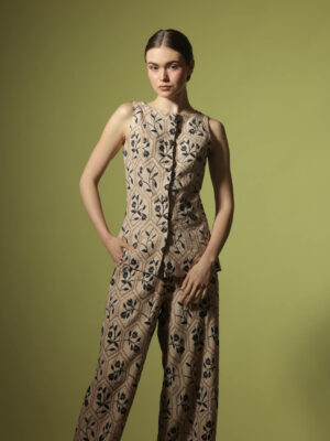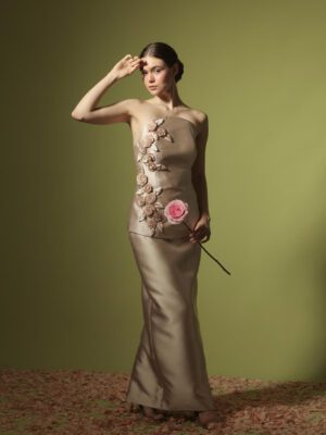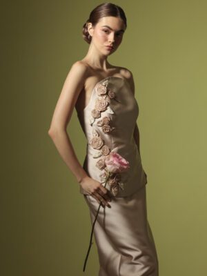 Tan Mikado silk coordinated corseted structured top embellished with rosette details with floor length pencil cut skirt