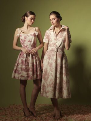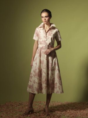 Red and cream toile du jouy shirt dress with short sleeves and bias cut midi skirt with secret side pockets