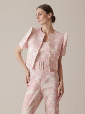 Pink and cream toile du jouy coordinated Filipiniana cover up with Imelda Sleeves with tube top and tailored pants with belt