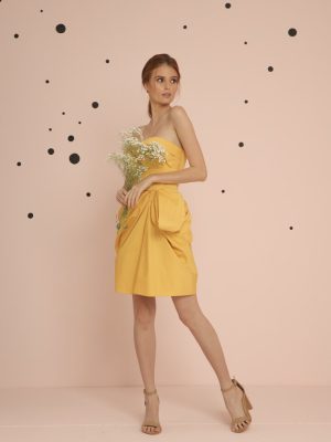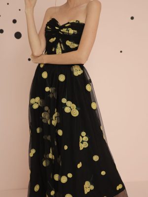 Black and yellow floral embroidered tulle tea length dress with ruched bodice in sweet heart neckline and full bias gathered skirt