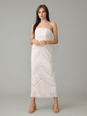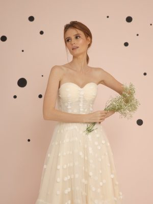 Cream polka dot embroidered tulle tea length dress with corseted ruched bodice and full bias gathered layered skirt