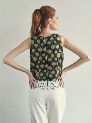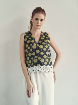 Yellow and grey floral silk brocade tea length dress with v neckline, bias cut skirt and secret side pockets