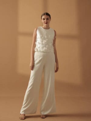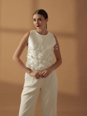 White Mikado silk coordinated corseted bustier cropped top and A-line mini skirt embellished with 3d floral appliqques
